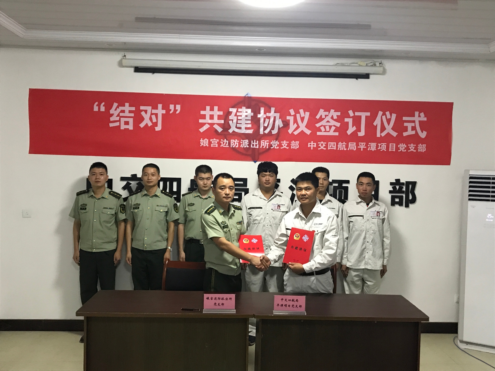 平潭项目部联合平潭娘宫边防派出所共同开展“党支部共建协议”主题活动。活动中,项目部与边防派出所分享了四航的企业文化、历史与荣誉,引领边防警官参观了项目施工现场及生活营区,介绍了项目工程概况和相关施工工艺。边防战士帮助项目部员工重温军事训练,宣传桥头堡警营文化,展示军队化管理的生活理念与作风。通过“警企互动、区域互助”的方式推动双方党建工作规范、创新、健康发展,提升共建党支部的党务工作水平。