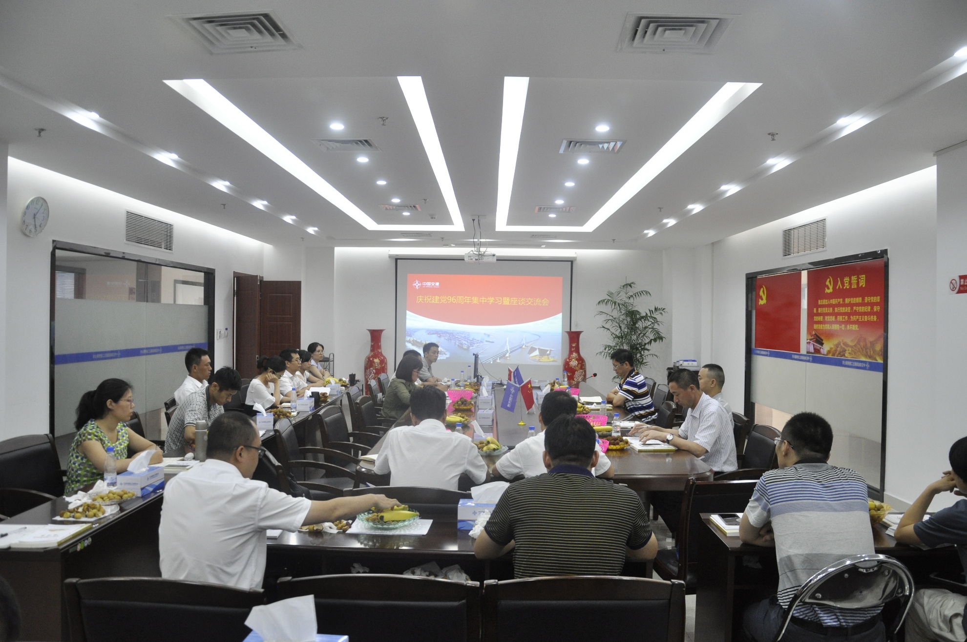 公司本部组织开展庆祝建党96周年集中学习暨座谈交流会,本部党员、各项目党支部书记、副书记参加。座谈会上,观看了全国优秀共产党员廖俊波先进事迹微电影和《时代楷模——港珠澳大桥建设事迹报告会》专题片,通过对廖俊波先进事迹和专题片的观看学习,进一步增强了党员的党性意识,增强了大家作为中交人的自豪感和荣誉感。在影片结束后,党员们纷纷发表自己的观影感悟,表示要向廖俊波同志、林鸣同志和港珠澳大桥建设团队学习,对党忠诚、扎实工作,充分发挥共产党员的先锋模范作用,为公司发展贡献力量。