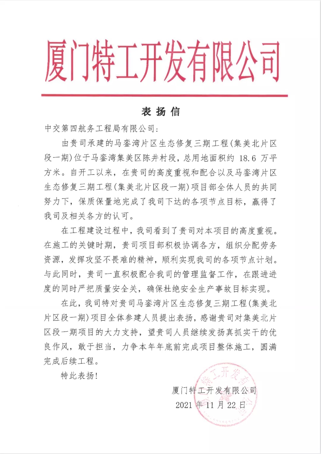 11月22日,马銮湾项目部收到业代厦门特工开发有限公司发来表扬信。信中对公司顺利完成马銮湾片区生态修复三期工程(集美北片区段一期)各项节点计划提出表扬,并对项目全体参建人员表示感谢。