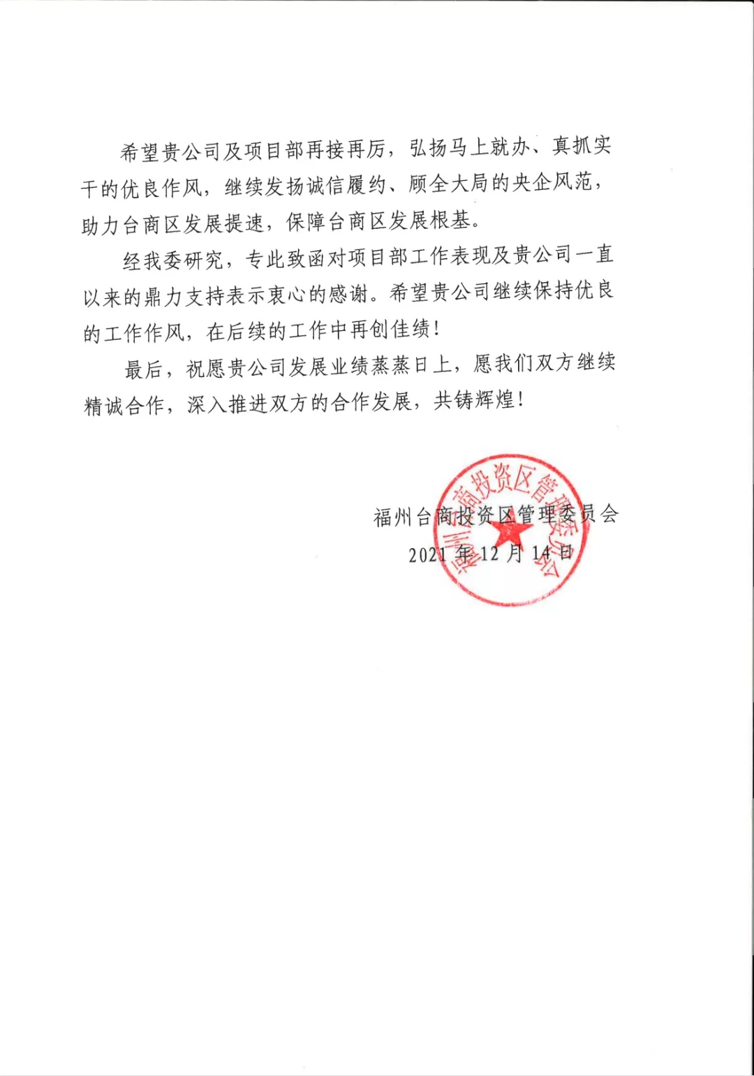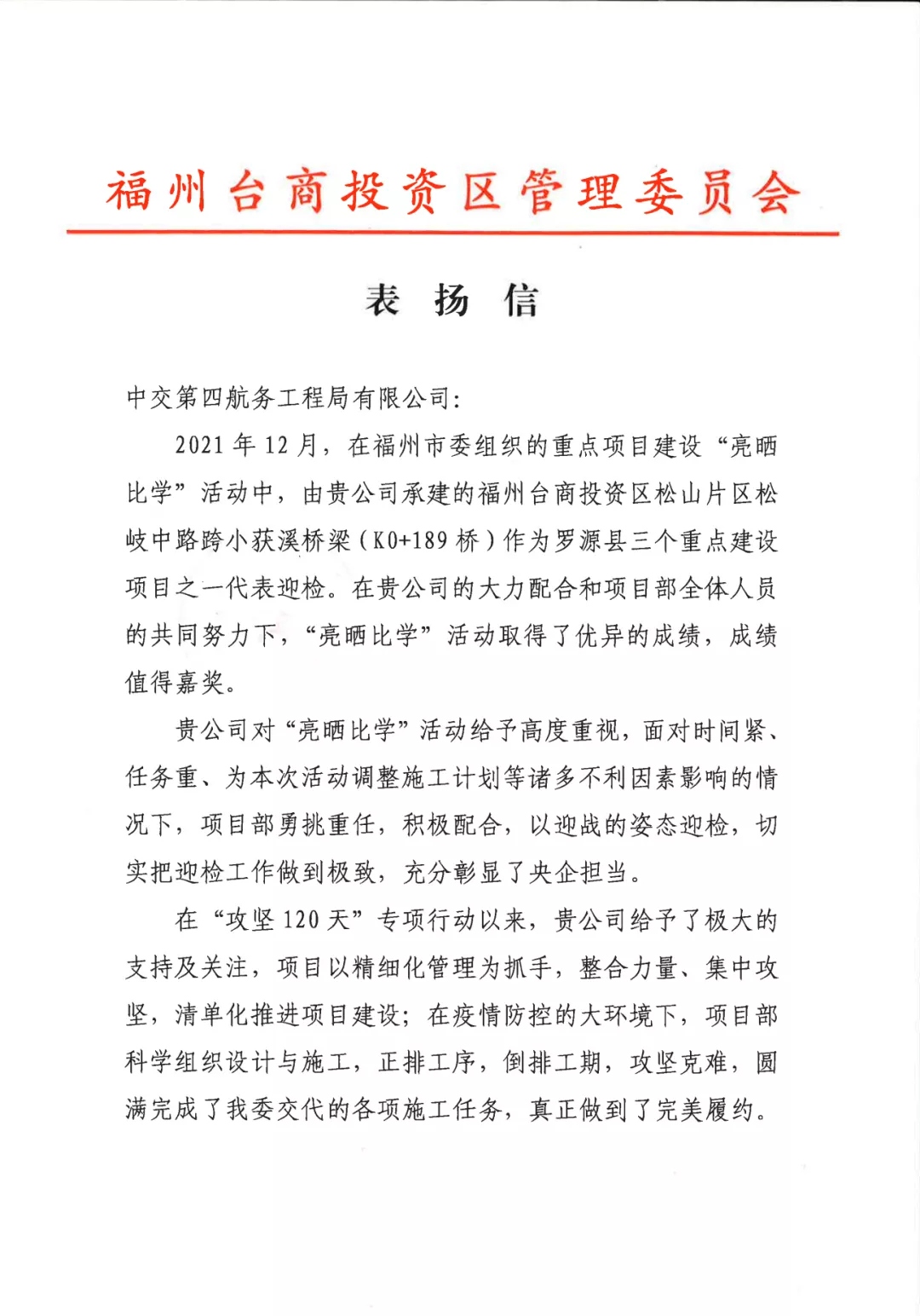 12月14日,公司收到福州台商投资区管理委员会发来的表扬信,信中对公司在福州市委组织的重点项目建设“亮晒比学”活动中取得的优异成绩提出嘉奖。