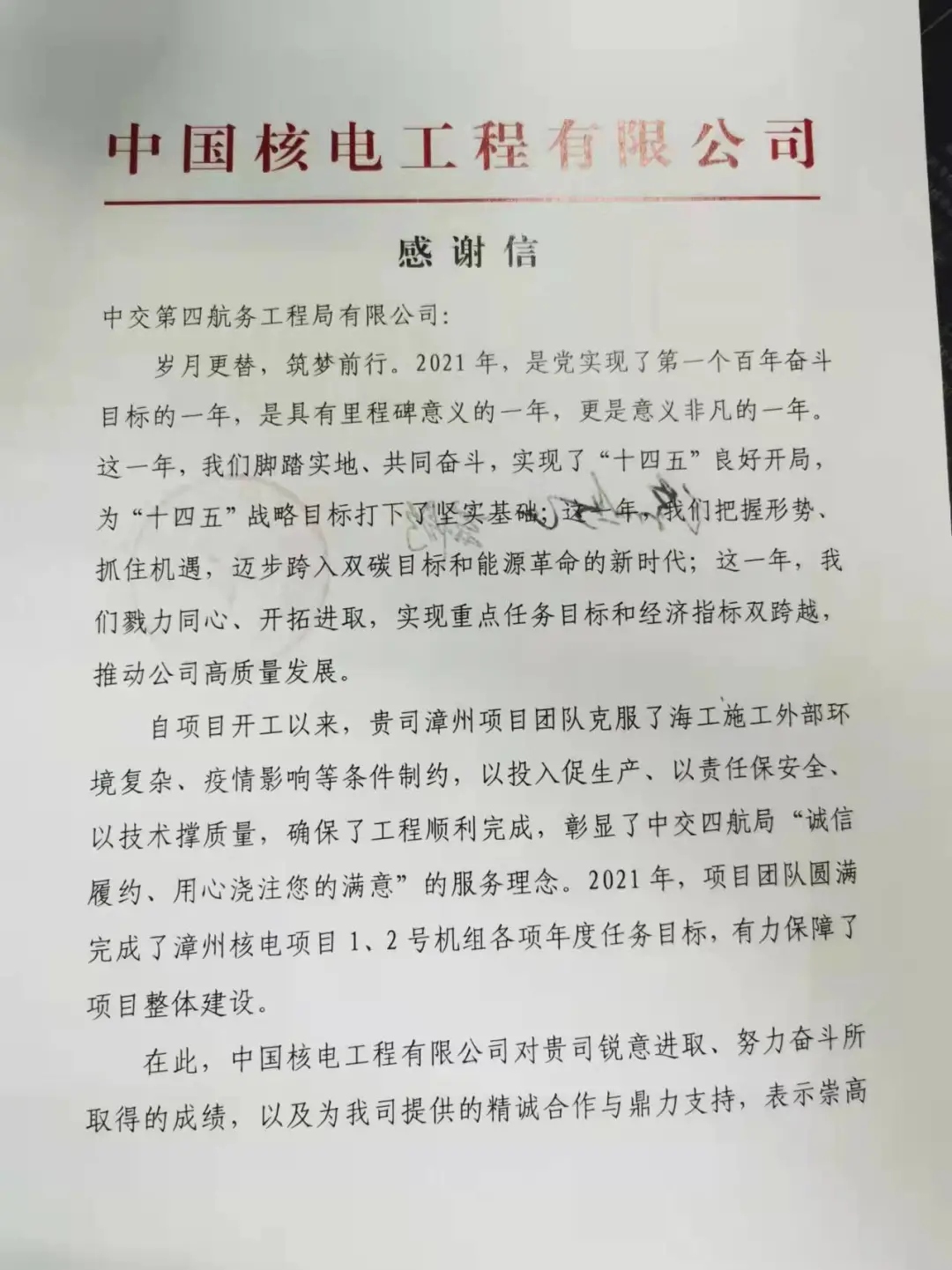 信中指出,自项目开工以来,公司漳州核电项目部克服了海工施工外部环境复杂、疫情影响等条件制约,以投入促生产、以责任保安全、以技术撑质量、确保了工程顺利完成,彰显了中交四航局“诚信履约、用心浇注您的满意”的服务理念。
