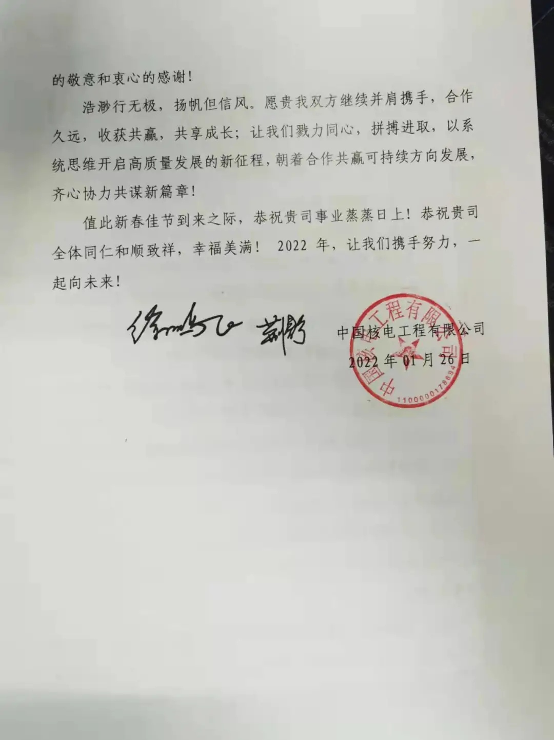 1月26日,公司收到中国核电工程有限公司发来的感谢信,信中对公司圆满完成漳州核电项目1、2号机组各项年度任务指标提出表扬,并对项目全体参建人员表示感谢。