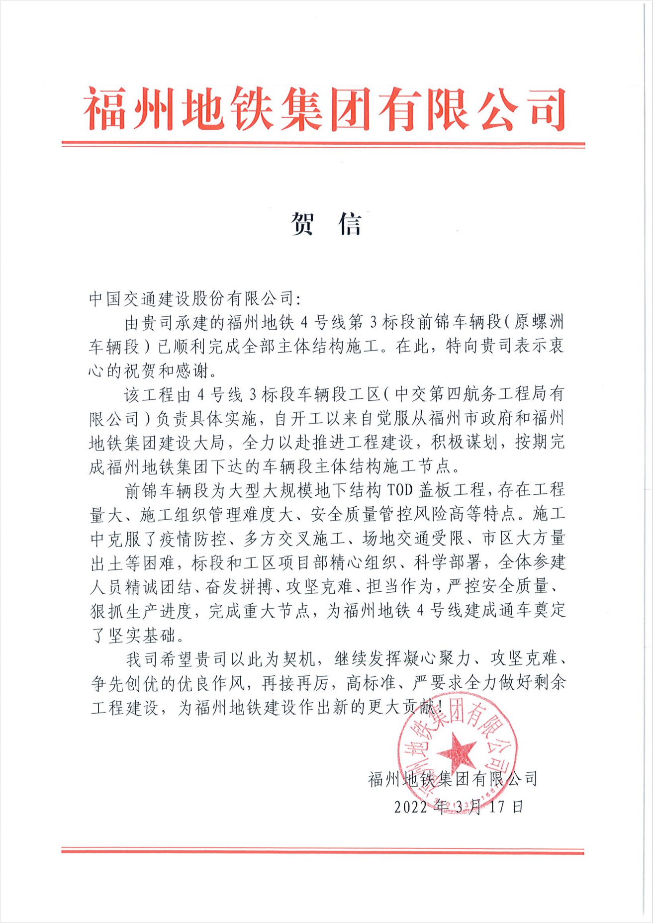 3月17日,公司收到福州地铁4号线项目业主单位福州地铁集团发来贺信,信中对公司承建的福州地铁4号线第3标段前锦车辆段主体结构安全顺利封顶表示热烈的祝贺和衷心感谢。