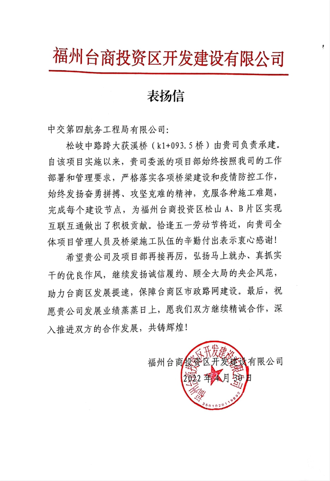 表扬信指出,项目部严格落实各项桥梁建设和疫情防控工作,始终发扬奋勇拼搏、攻坚克难的精神,克服各种施工难题,完成每个建设节点,为福州台商投资区松山A、B片区实现互联互通做出了积极贡献。