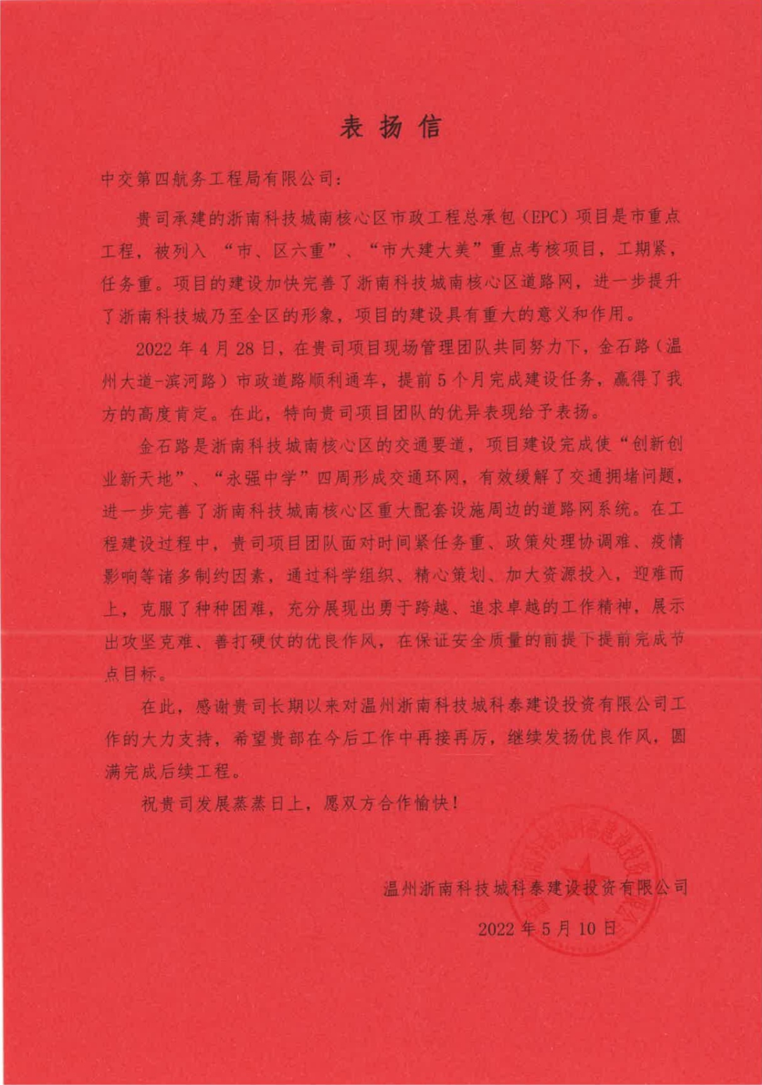 近日,公司收到温州浙南科技城科泰建设投资有限公司发来的表扬信,信中对公司提前5个月完成金石路(温州大道—滨河路)市政道路通车任务给予表扬并表示感谢。