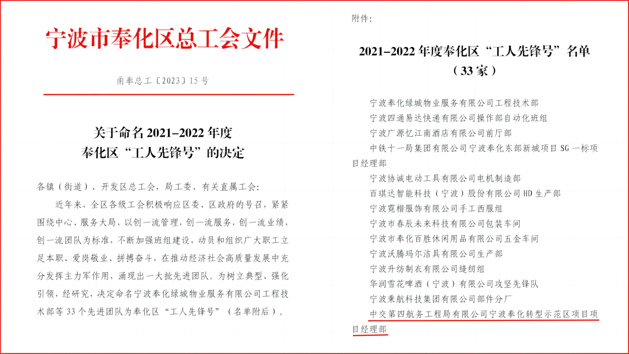近日,宁波市奉化区总工会发布《关于命名2021-2022年度奉化区“工人先锋号”的决定》文件,宁波奉化项目部喜获2021-2022年度奉化区“工人先锋号”荣誉称号。