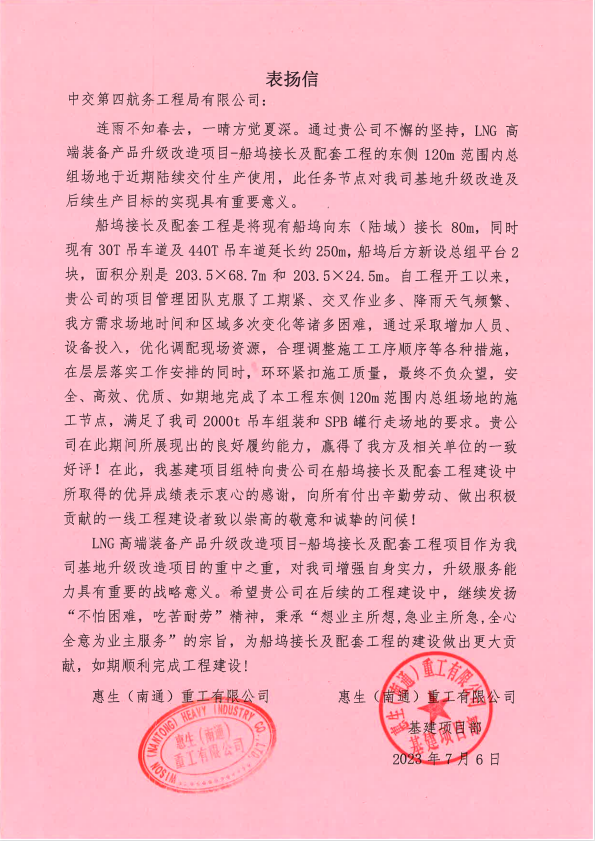 近日,公司收到业主惠生(南通)重工有限公司发来的表扬信。信中对公司给予LNG高端装备产品升级改造项目-船坞接长及配套工程建设的长期支持和配合表示感谢。