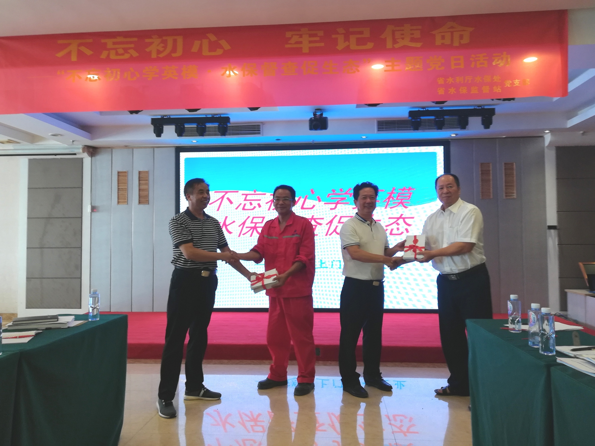 检查期间,省厅督察组水保处党支部、水保监督站党支部还与项目党支部联合开展了“不忘初心学英模,水保督查促生态”主题党日活动。座谈征求改进工作作风、廉政建设意见,促进党支部服务水平的提升等议题。会上林捷代表省厅党支部为项目党支部赠送了水土保持相关法律法规书籍。