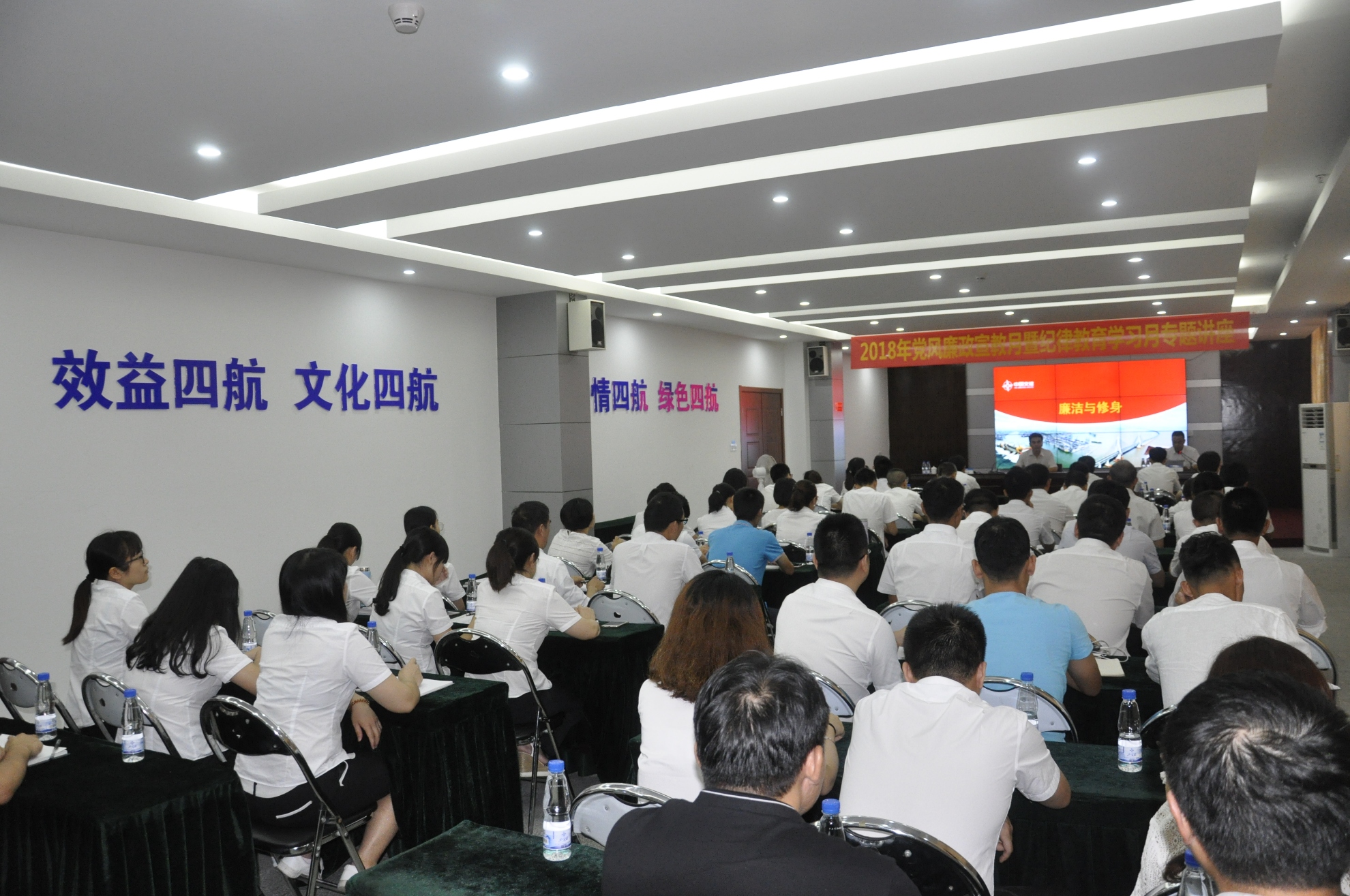 8月17日,公司组织召开2018年党风廉政宣教月暨纪律教育学习月专题会议,会议邀请了福州市纪委纪检监察员黄昭忠作《廉洁与修身》专题讲座,公司纪委书记龙海飚主持会议。公司在家领导班子成员、总经理助理、本部各部门正副职、管人管钱管物三管人员、本部党员职工代表、部分司属单位代表60余人参加了会议。