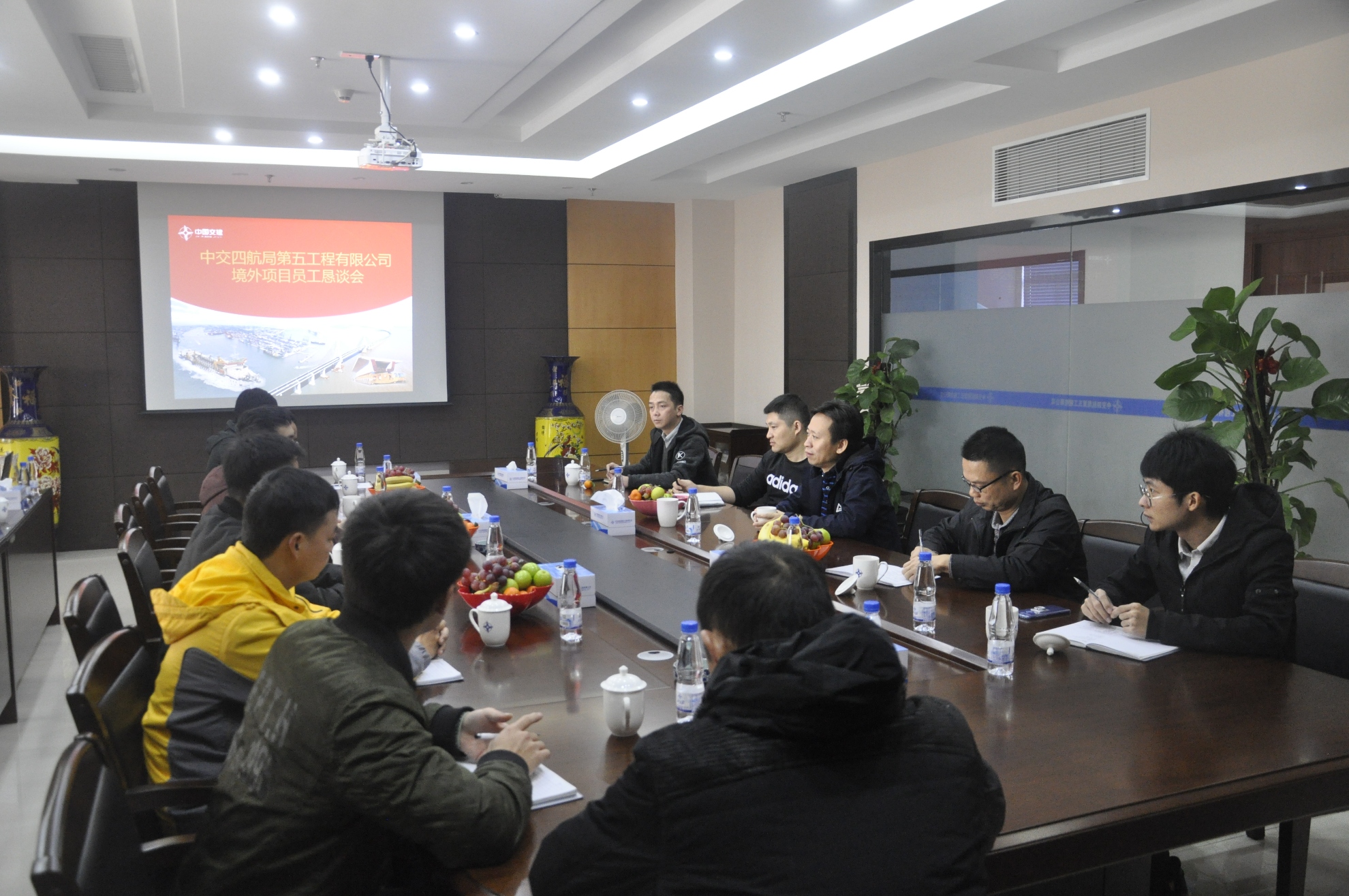 居治安结合个人境外工作生活经历分享了经验并作了总结讲话。他指出,员工到境外工作是切实融入企业发展大局、快速提升自身能力的一种有效途径,他勉励到境外项目工作的员工要树立和保持“身心健康、快乐阳光”的工作生活状态,增强使命感和责任感,立足自身岗位,扎实做好海外市场的开拓和项目建设工作,为公司发展壮大贡献更大力量。同时要求公司本部相关部门和海外项目部要努力为境外员工创造更好的工作和生活条件,落实关爱员工的有效措施,构筑好员工的精神家园,实现企业和员工的共同发展。会上,居治安还对两位即将奔赴海外的员工表示了慰问,希望他们在海外工地度过一个祥和温暖的春节。
