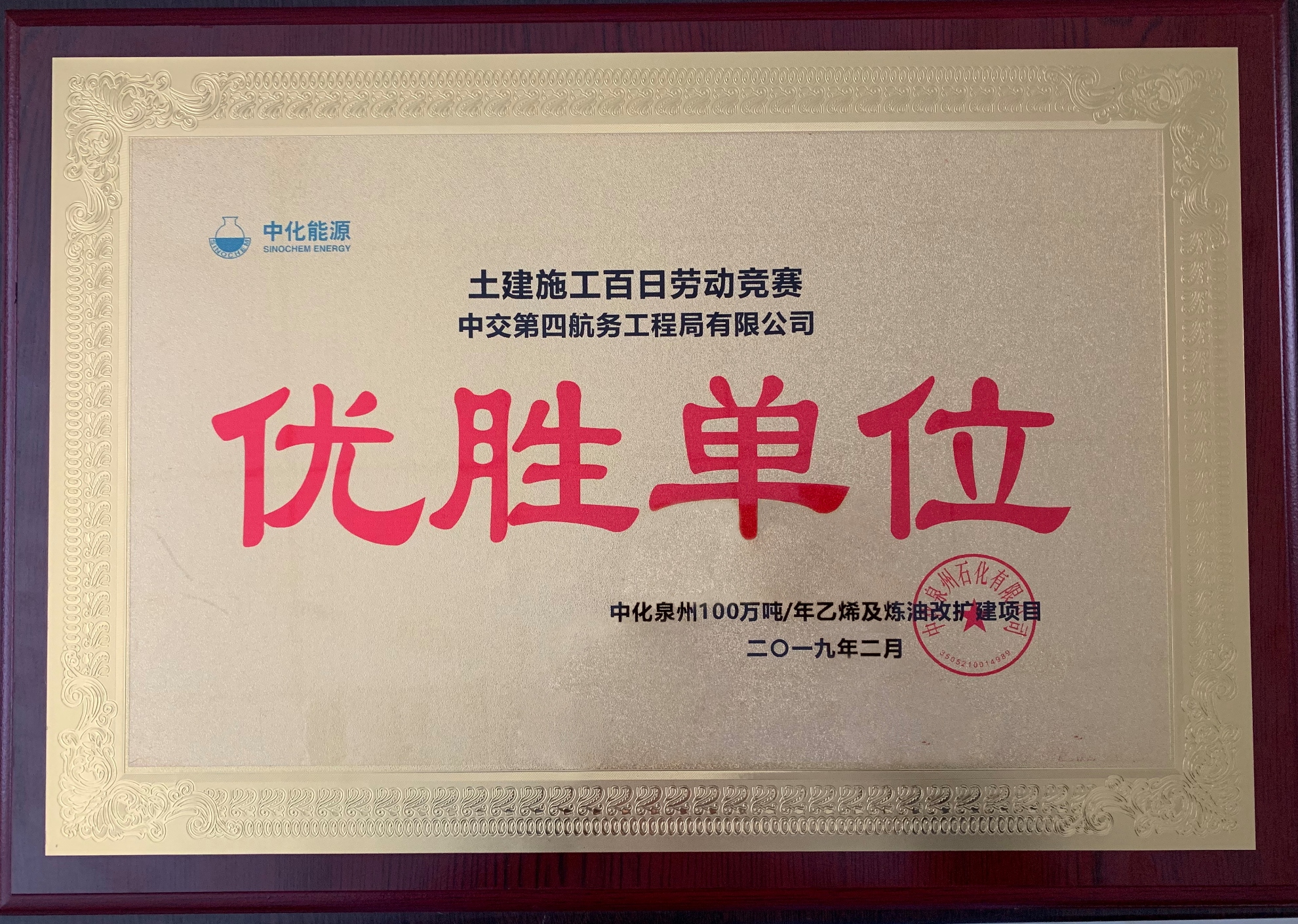 中化泉州乙烯项目土建百日劳动竞赛是泉州市委市政府重点关注活动,由中化集团指导、中化泉州乙烯项目部组织实施。自劳动竞赛开展以来,公司中化泉州乙烯项目部积极响应业主号召,认真组织,扎实开展,根据项目节点工期目标,从资源配置、技术储备等方面编制周详计划,努力克服安全风险大、工期紧张、施工点多面广、大风降温天气等不利因素,不断提高施工技术水平和施工进度、效率,在保持HSE和质量月度考评始终名列前茅的前提下,各分项工程完成值达到目标值的150%-200%,项目建设始终处在进度领先的第一阵营,提前超额完成了劳动竞赛目标任务,获得业主和监理的一致好评。