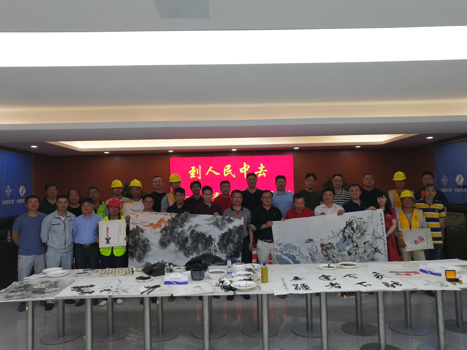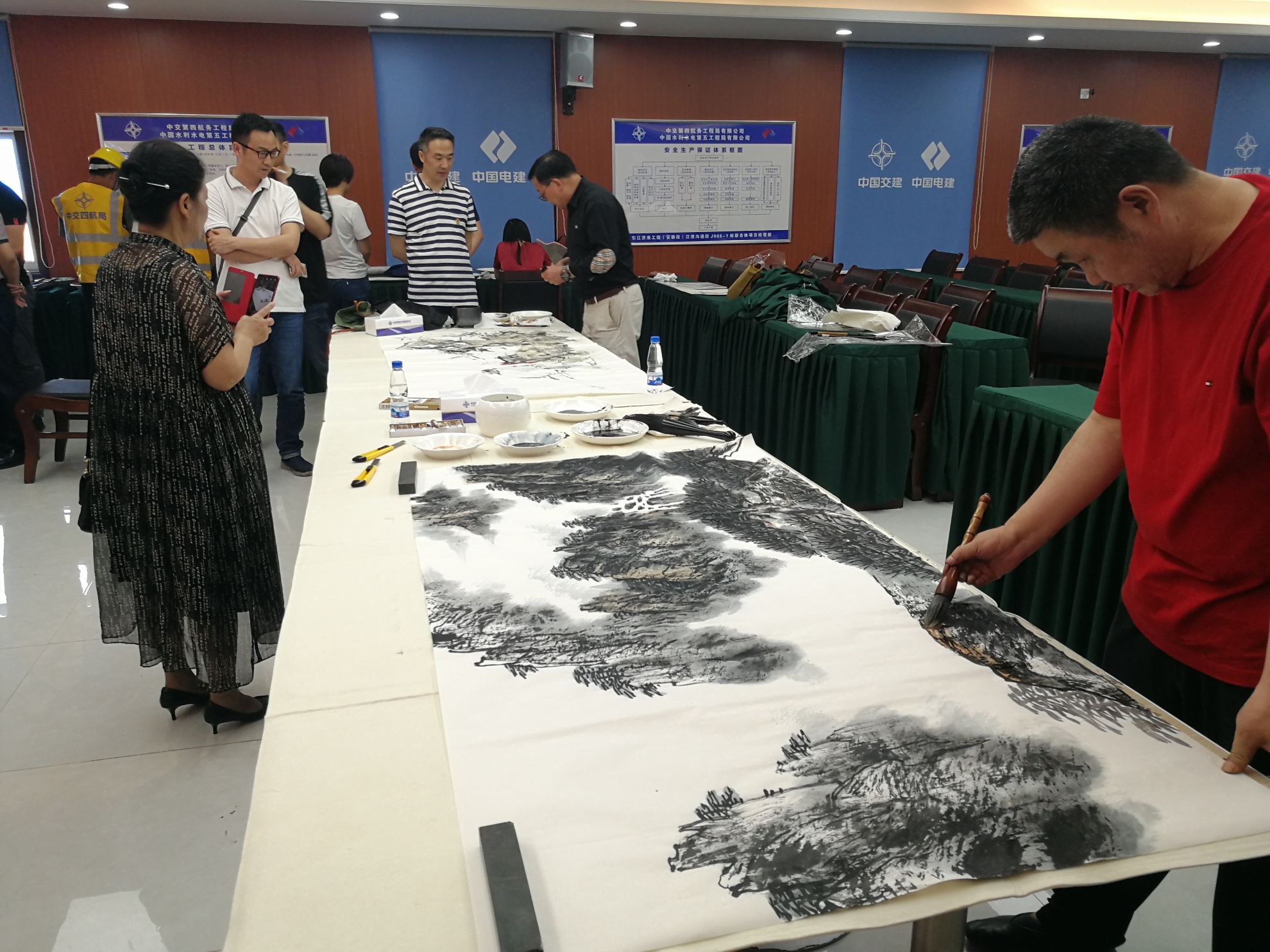 志愿服务小分队首先参观了施工现场,观看了引江济淮工程及中交四航局宣传视频。随后,志愿服务小分队邀请项目部员工及一线作业工人欣赏他们的书画艺术创作,作为安徽省文联文艺界的顶尖人物,大师们通过温婉细腻、豪放洒脱的手法,将一幅幅绝美山水画、人物画艺术作品跃然纸上,既有刻画祖国大好河山的波澜壮阔,也有描写新时代人民美好生活的点点滴滴。绘画结束后,艺术家们还大展书法,为项目职工及工人挥毫题字。
