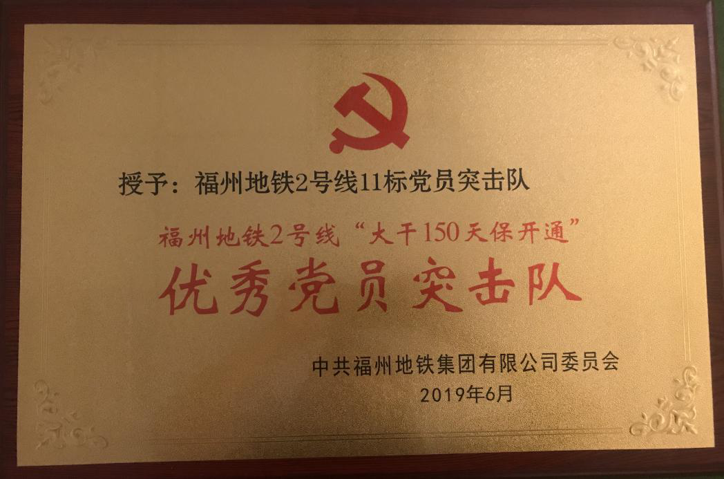 6月20日,福州地铁集团召开成立10周年纪念大会,并对参与福州地铁2号线项目建设的先进集体、先进个人等进行表彰。公司福州地铁2号线项目部荣获“2号线建设先进集体”、“2号线大干150天保开通优秀党员突击队”两项集体荣誉。