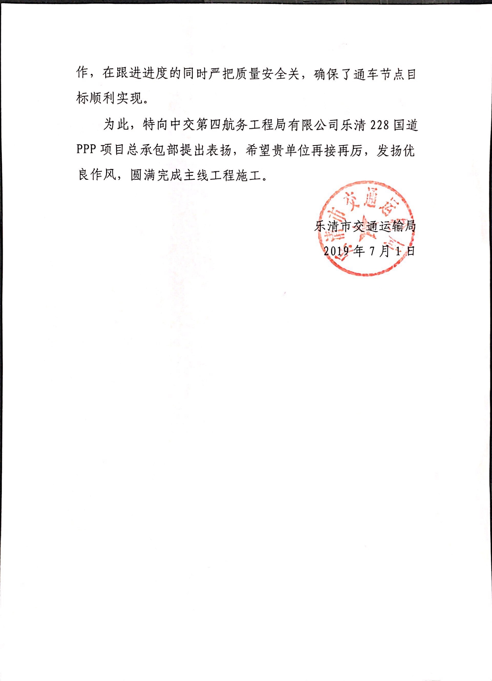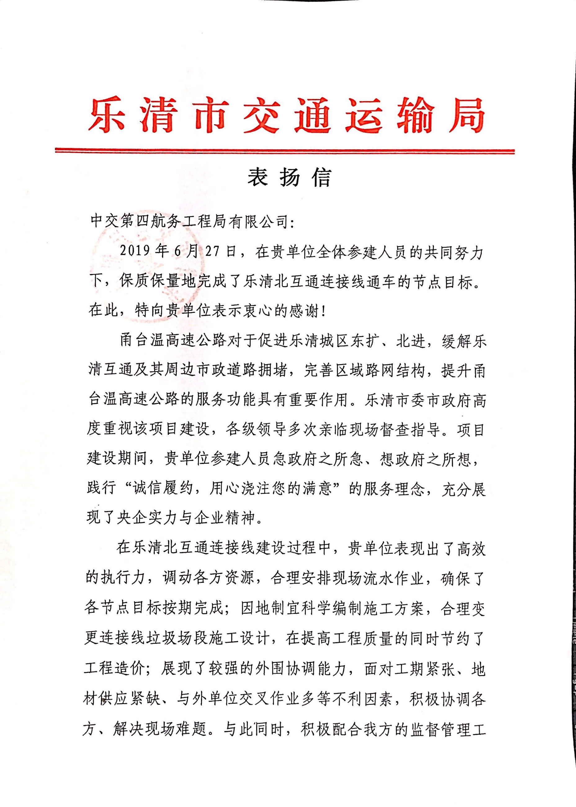 近日,228国道乐清总承包部收到来自乐清市交通运输局的表扬信。