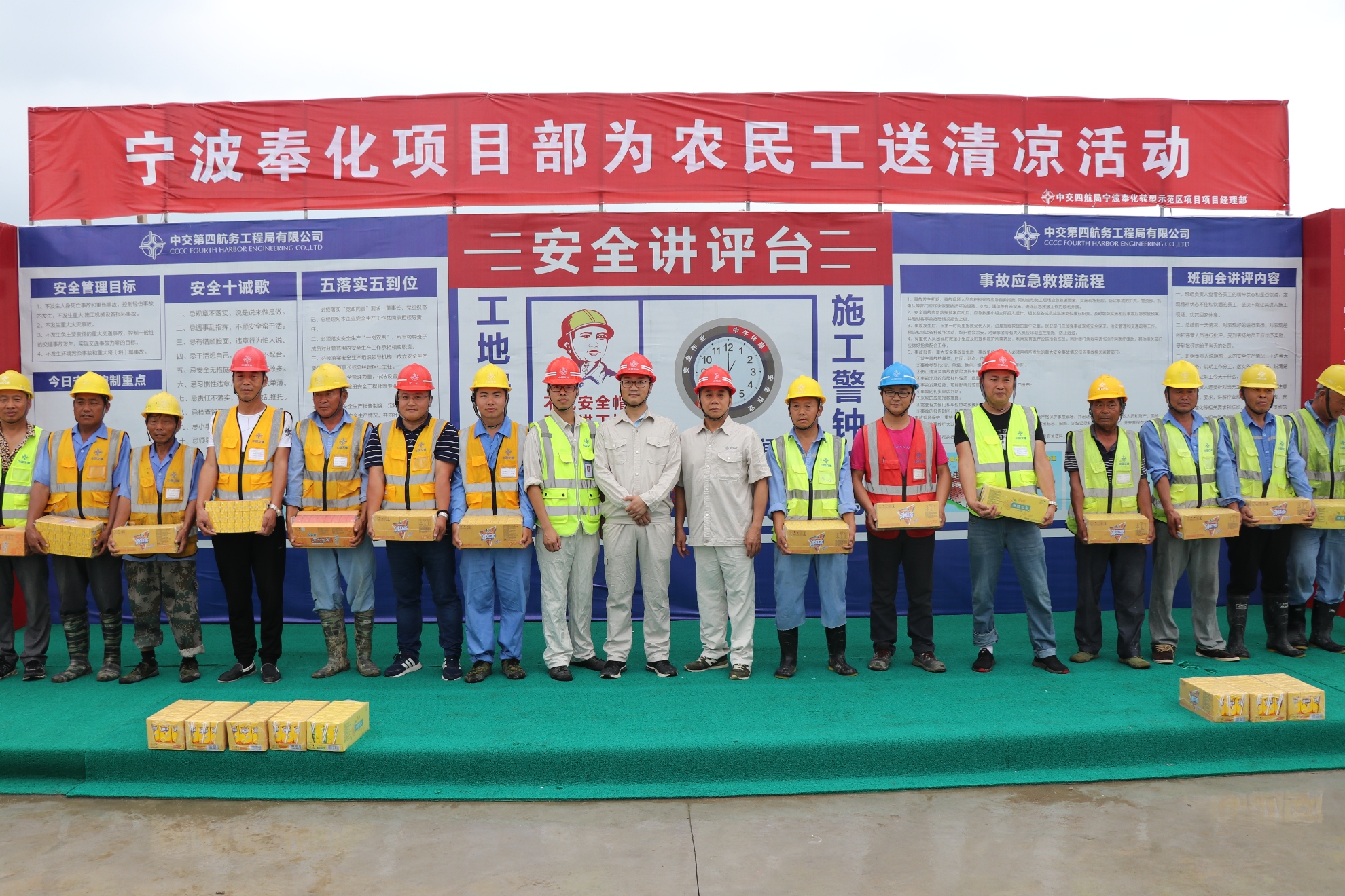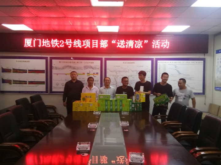 公司本部、福州地铁4号线、厦门地铁2号线、宁波奉化、汕头市政、万安、中化泉州乙烯等单位纷纷开展了“夏送清凉”活动。活动中,各项目工会结合实际为施工班组人员、和一线员工送去西瓜、藿香正气水、绿茶、绿豆汤等防暑降温物品。同时,各单位在高温天气期间,采取合理安排工作时间、轮换作业、适当增加高温工作环境下劳动者的休息时间和减轻劳动强度、减少高温时段室外作业等措施,预防和控制中暑及各类生产安全事故的发生,确保广大职工平安度夏。