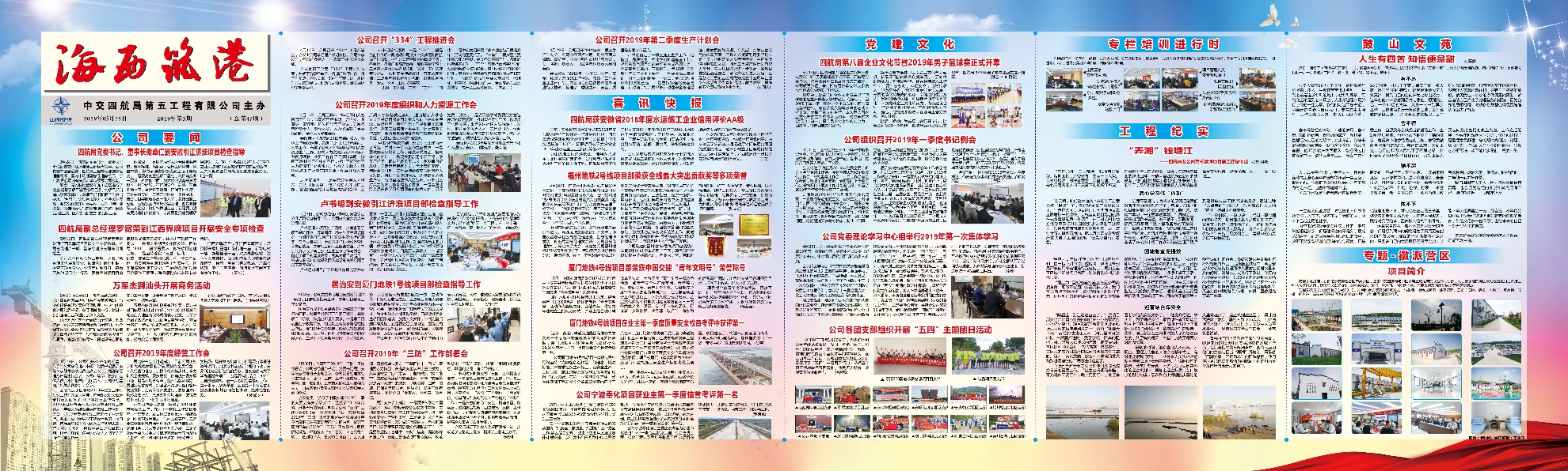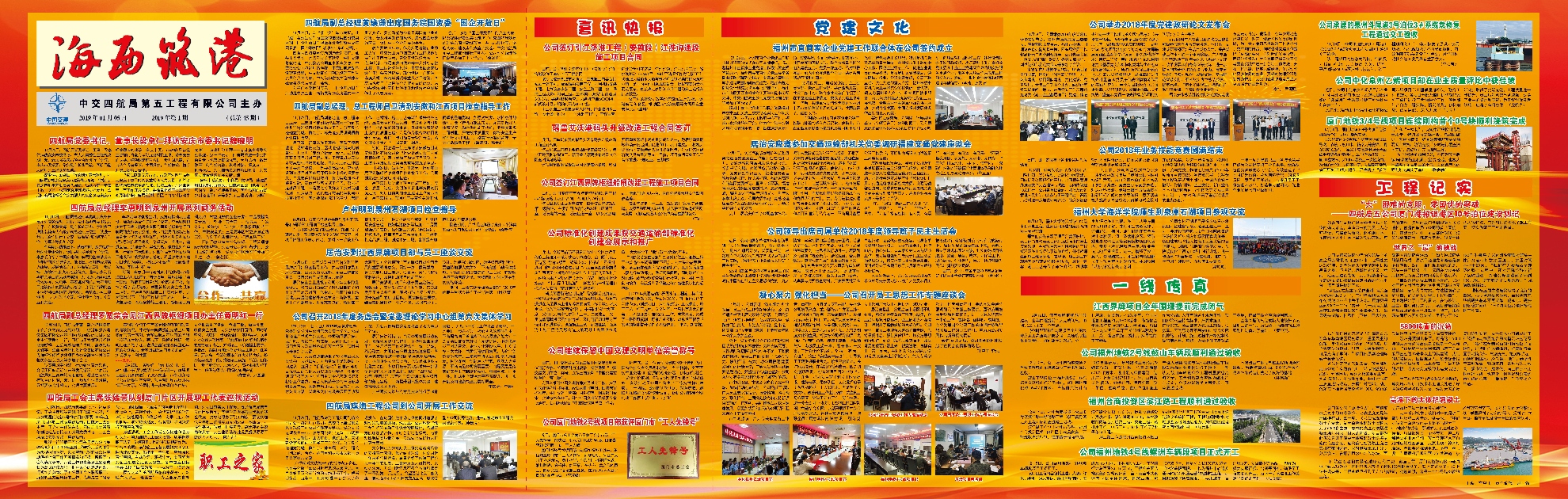 公司充分重视企业文化建设,作为公司的重要宣传阵地,公司《海西筑港》报始终立足企业中心,扎根施工一线,传播四航五好声音,展示四航五好形象。公司各项目部文化建设也日益繁荣,涌现出了以《鹭岛轨迹》为代表的一批优秀文化品牌,形成了良好的文化宣传氛围。
