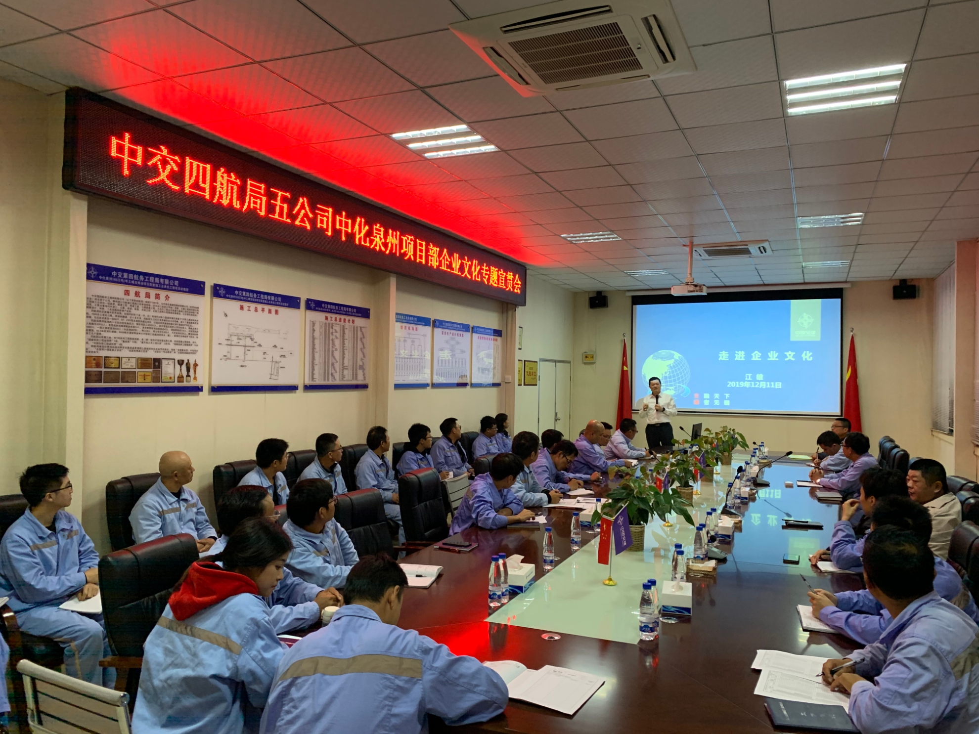 12月11日,公司党委书记江雄到中化泉州项目开展企业文化专题宣贯会,公司副总经理黄红宇、工会办有关人员、项目领导班子及项目管理人员参加了宣贯会。