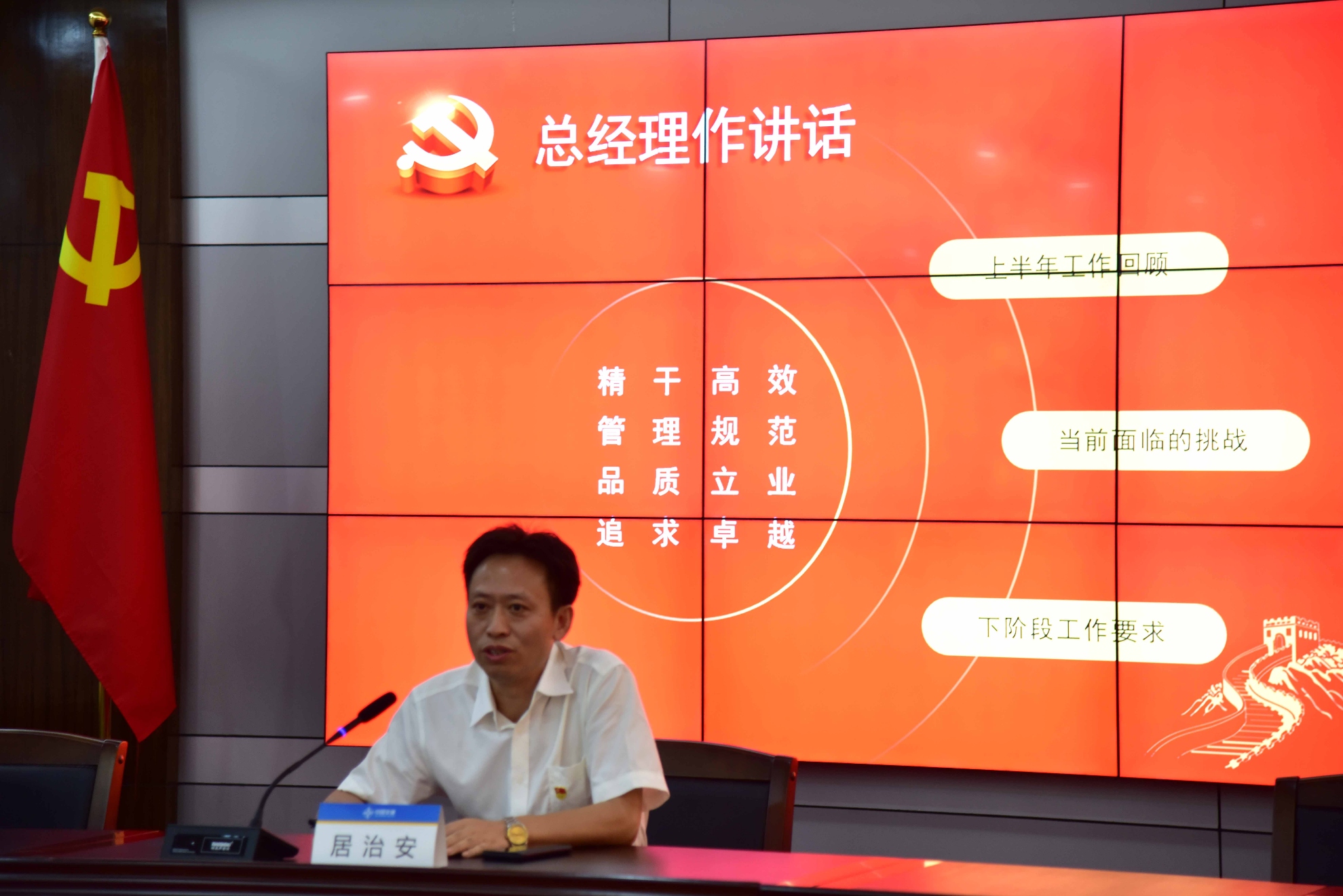 居治安在会上通报了公司上半年在市场开发、项目履约、安全环保、质量管理、信用考核、人才建设等各项工作的完成情况,对下半年工作提出了要求。他指出,公司正处于转型升级、快速发展的崭新阶段,下半年任务依然艰巨,机遇与挑战并存,希望大家一是要把握好安全和质量、技术管控的辩证关系,群策群力,多管齐下,确保公司平稳运行;二是要统筹资源,重点突破,发扬“敢打硬仗、能打胜仗”的顽强作风,确保关键性项目顺利履约,从而带动按计划全面完成公司年度生产目标;三是要继续抓好员工队伍建设,尤其要提升本部的协同作战能力和指导服务能力,确保公司持续发展;四是要统一思想,坚定信心,心往一处想、劲往一处使,敢于冲破思想藩篱,大胆求实创新,推动公司实现更大发展。