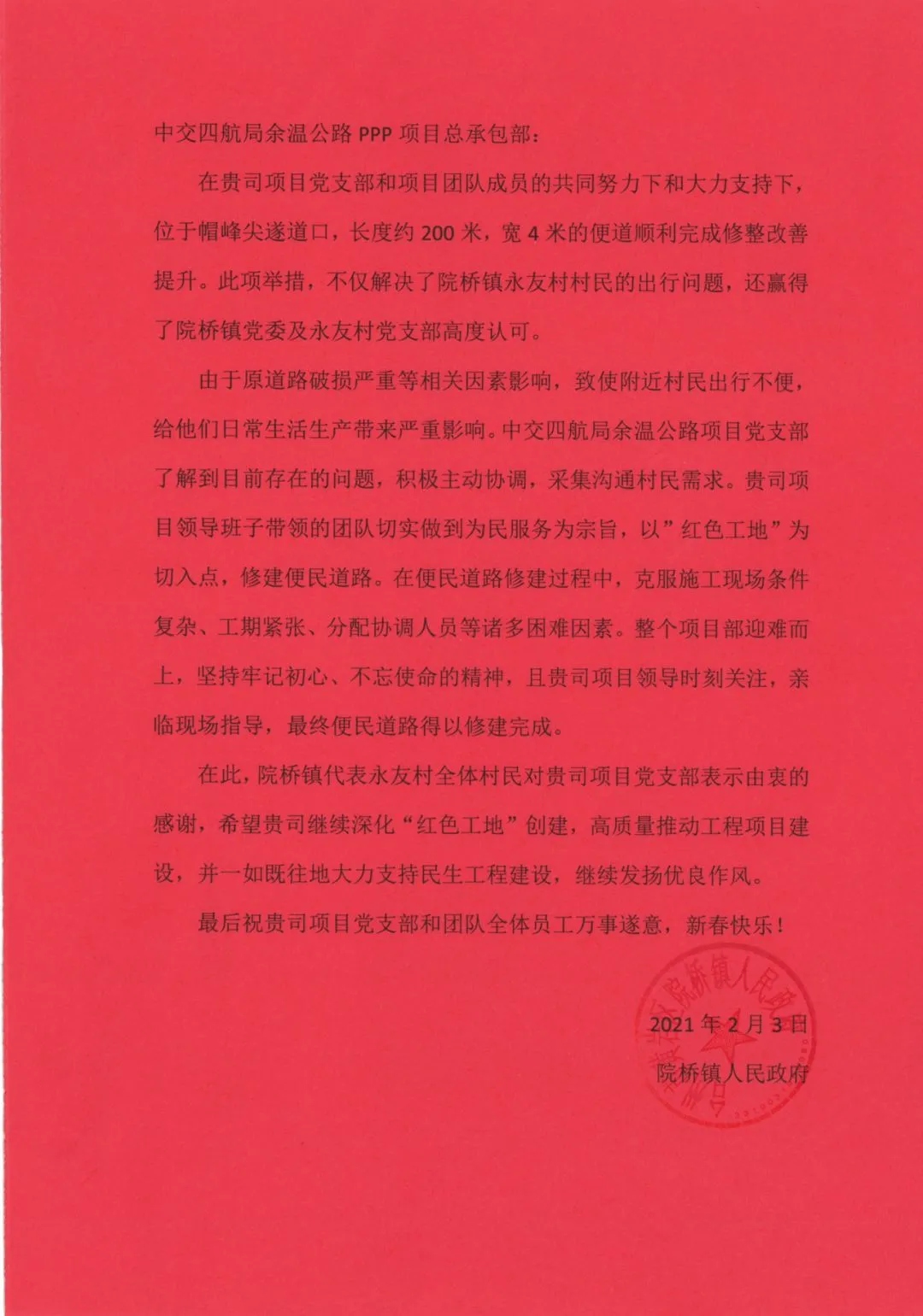 信中指出,自项目部成立以来在项目领导班子的带领下,项目部全体人员以为民服务为宗旨,以“红色工地”为切入点,积极组织施工队伍对永友村附近道路进行修复施工,经过半个月的连续奋战,安全高效、保质保量地完成了该项任务,极大的解决了院桥镇永友村村民的出行问题,赢得了院桥镇党委及永友村党支部的高度认可。