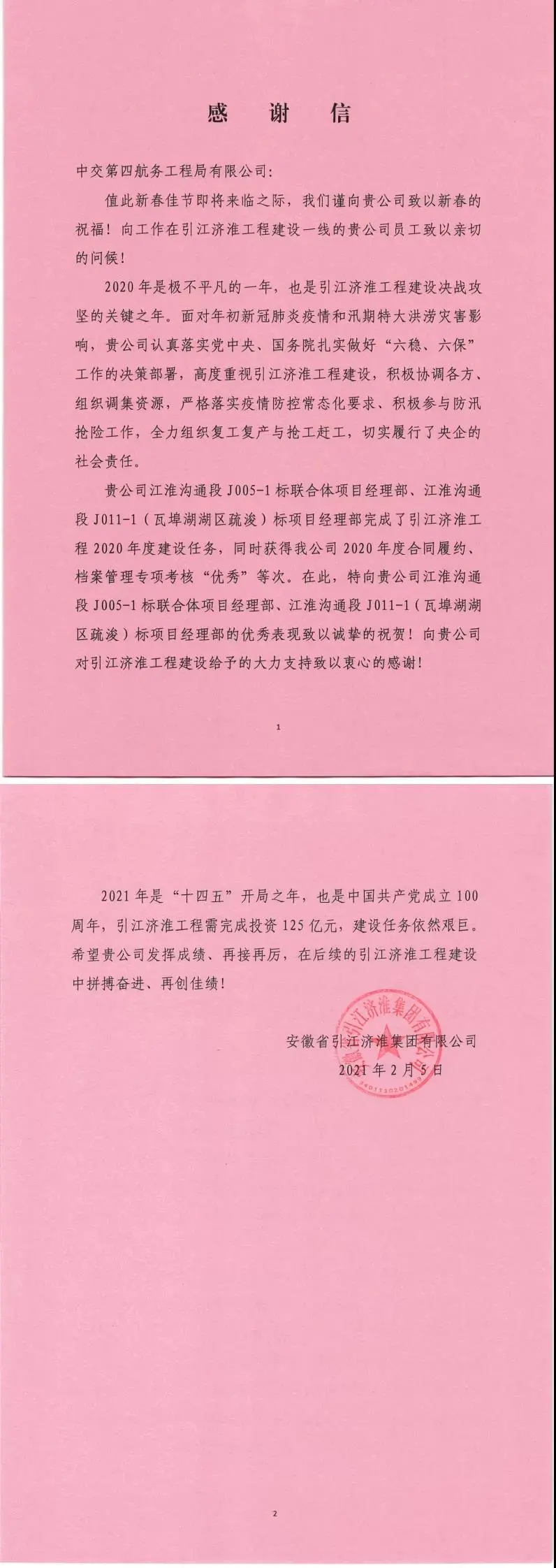 2月5日,安徽省引江济淮集团有限公司发来感谢信。信中对安徽瓦埠湖项目克服因疫情防控导致的工期延误和汛期特大洪涝灾害等种种困难挑战,顺利完成引江济淮工程2020年度建设任务、荣获引江济淮集团2020年度合同履约、档案管理专项考核“优秀”等次表示祝贺和感谢。
