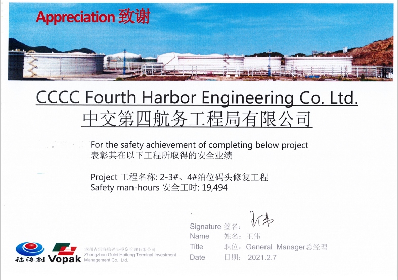 表扬信对海腾码头项目本年度节点目标所付出的努力与作出的贡献表示感谢。信中指出,海腾码头2-3#、4#泊位修复工程,施工期间严格按照化工企业高标准、高要求进行安全管理施工,能够积极主动地接受业主的检查督导,积极配合监理工作,大力发扬“一不等,二不靠”的服务理念,克服了任务重、作业环境复杂等诸多困难,提前出色地完成了本年度的施工任务。