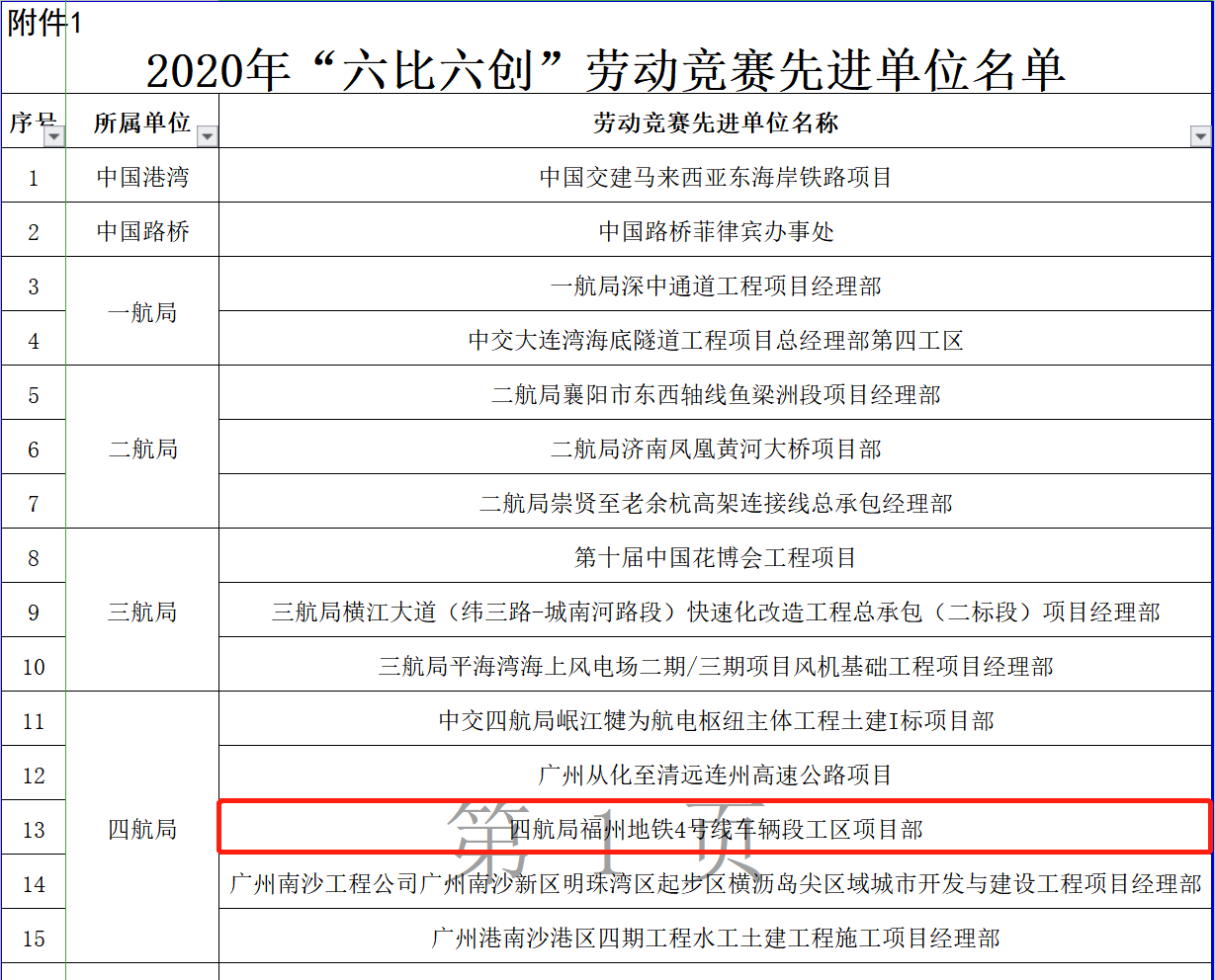 近日,为鼓励先进、树立标杆、形成示范,中交集团公布了2020年“六比六创”劳动竞赛的先进单位(个人)名单。四航局福州地铁4号线车辆段工区项目部荣获2020年“六比六创”劳动竞赛先进单位称号。