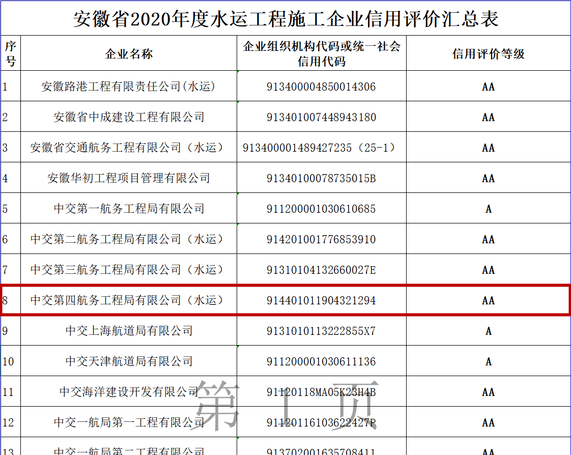 近日,安徽省交通运输厅公布2020年度公路水运工程施工企业信用评价结果,四航局被评为安徽省2020年度水运施工企业信用等级AA级。