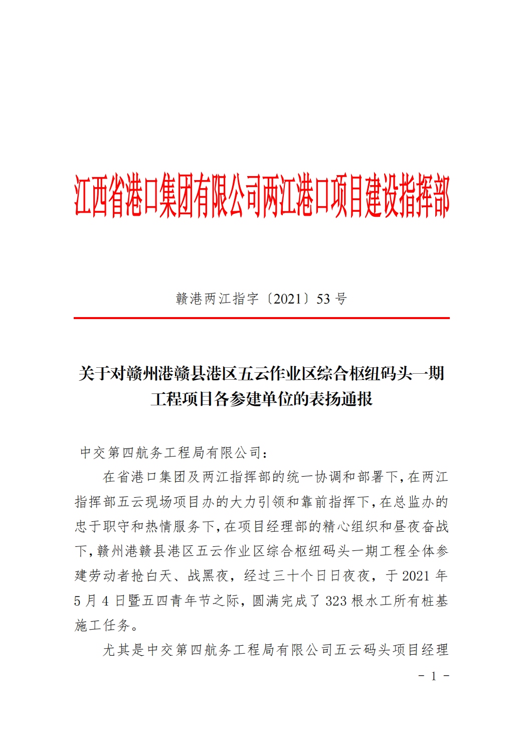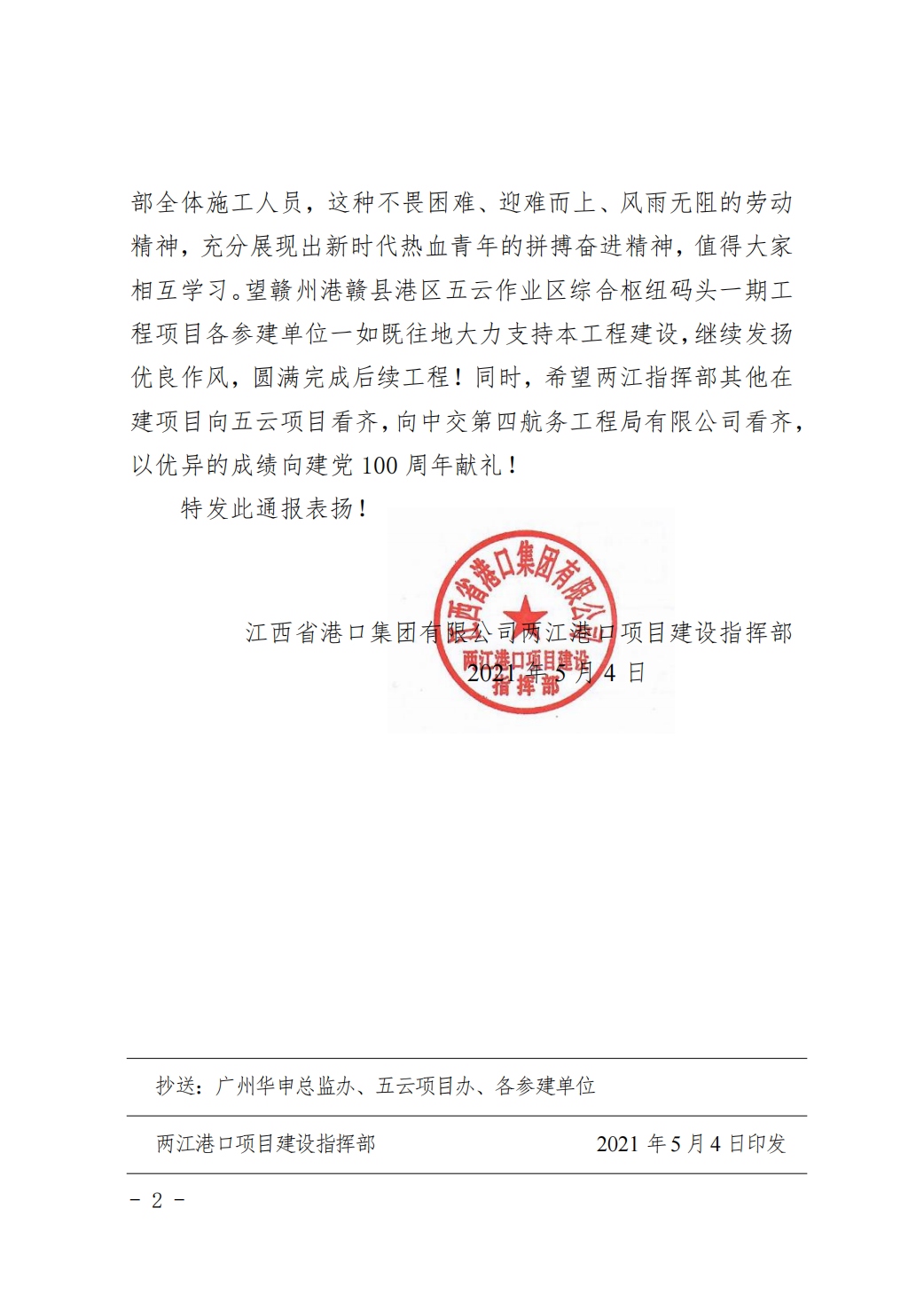 5月4日,公司收到江西赣州五云项目业主江西省港口集团有限公司两江港口项目建设指挥部发来的表扬通报,对赣州五云项目部如期圆满完成所有桩基施工任务节点提出表扬。